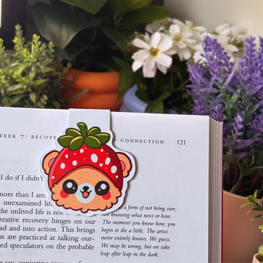 Bear with Strawberry Hat Magnetic Bookmark | Cute Berry Gift for Readers and Bookworms